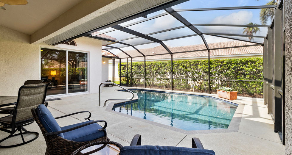Inside, enjoy high ceilings, crown molding, dual living areas, new lighting fixtures, and a light-filled open layout. Offered furnished, this home is truly move-in ready—ideal for either seasonal or full-time living. The kitchen and living spaces flow seamlessly to the outdoors, where a private pool with a tranquil water feature invites you to relax, entertain, and enjoy the Florida lifestyle. The spacious primary suite features a soaking tub, walk-in shower, and generous closet space.
